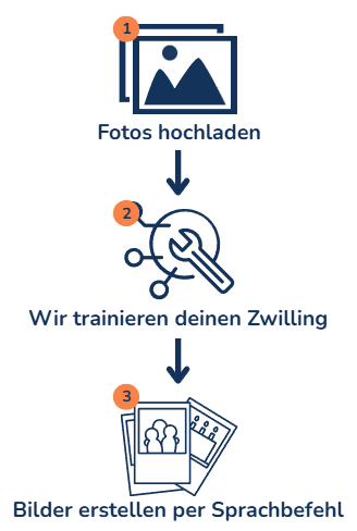 Wir erstellen deinen persönlichen KI-Zwilling auf Basis deiner Fotos. Danach brauchst du nur noch eine Sprachnachricht via WhatsApp schicken – und erhältst automatisch ein neues Bild von dir.