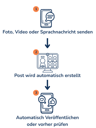 Erstelle Posts mit nur einer WhatsApp-Nachricht Du schickst ein Foto oder Video und eine Sprachnachricht – wir erstellen daraus einen perfekten Post für Instagram, Facebook und LinkedIn. In deinem Stil. Mit deinem Branding. Ohne Aufwand. Jetzt Erstgespräch buchen Warum Du nie wieder manuell posten musst Spare Zeit Kein Planen, kein Schneiden, kein Texten. Wir übernehmen das – 24/7. Treffe deinen Stil Dein Logo, deine Sprache, deine Zielgruppe. Automatisiert in deinem Layout. Skaliere deine Sichtbarkeit Regelmäßiger, hochwertiger Content auf Instagram, Facebook & LinkedIn. Ohne Mehraufwand In 3 Schritten zu deinem perfekten Post 1. Material senden (WhatsApp) Ein Foto oder Video + kurze Sprachnachricht.Bequem und schnell. 2.Wir erstellen deinen Content Unsere Automatisierung analysiert, gestaltet und textet – in deinem Branding. 3.Veröffentlichen oder prüfen Direkter Upload auf Social Media oder zur Freigabe per Vorschau. Multi Input – Bild, Video, VoiceMulti Output: Instagram, Facebook, LinkedInMulti Format: Post, Reel, Story Einfach starten. Groß rauskommen Du musst kein Social-Media-Profi sein – du brauchst nur WhatsApp. Wir kümmern uns um den Rest. Lass deinen Content für dich arbeiten. Jetzt Demo testen
